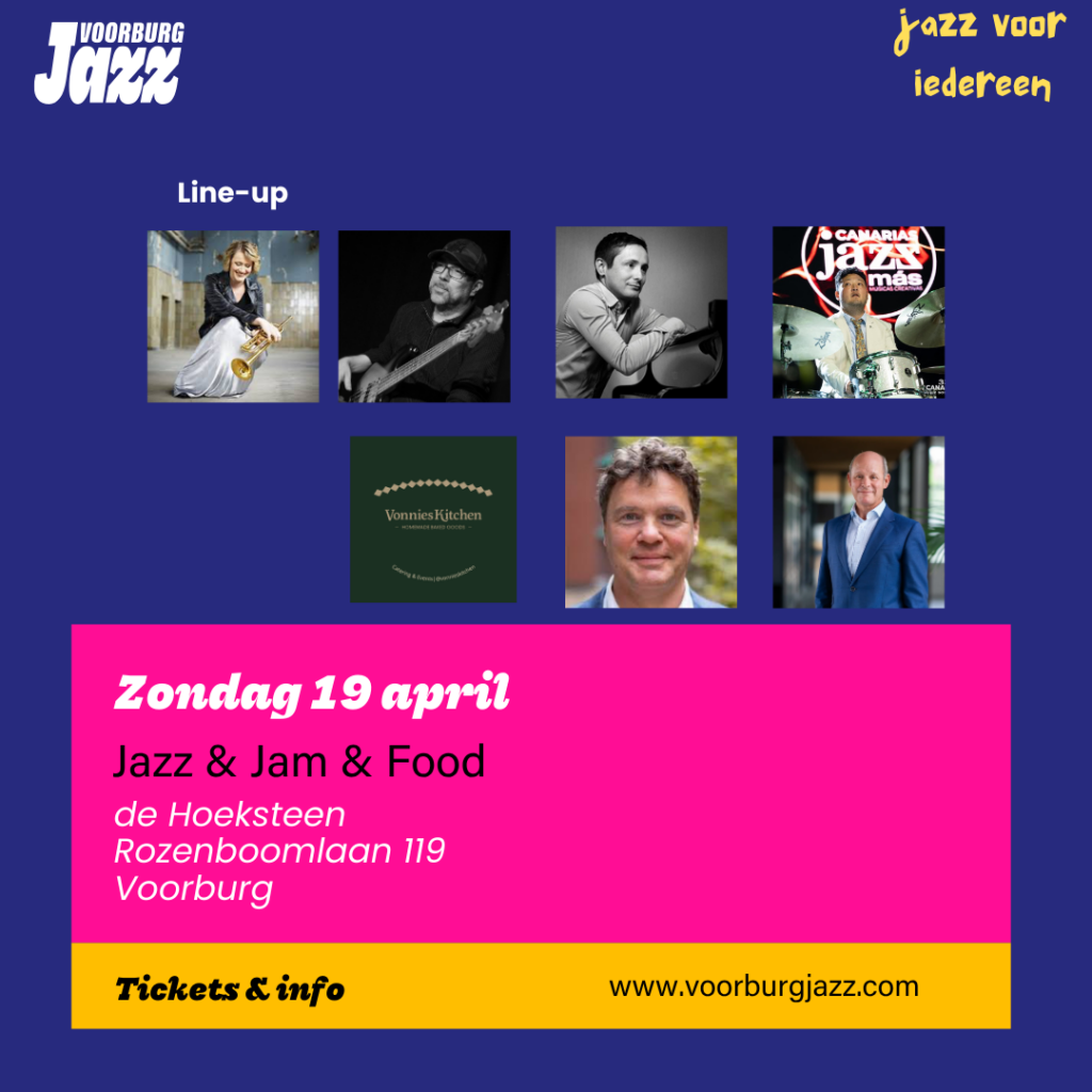 “Jazz om de hoek slaat aan”, zeggen ook de andere bestuursleden Ernst van Win en Tessa Daudeij. “Veel lokaties in Voorburg werken graag mee. We brengen jazz standards, vernieuwende composities en we schurken aan tegen andere muzieksoorten en kunstvormen. ‘Jazz washes away the dust of everyday life’, zei Art Blakey al.”